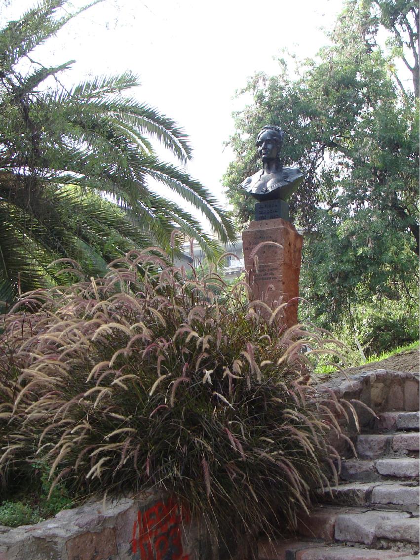 Aproximación al busto de Javiera Carrera en la entrada norte del Cerro Santa Lucía.